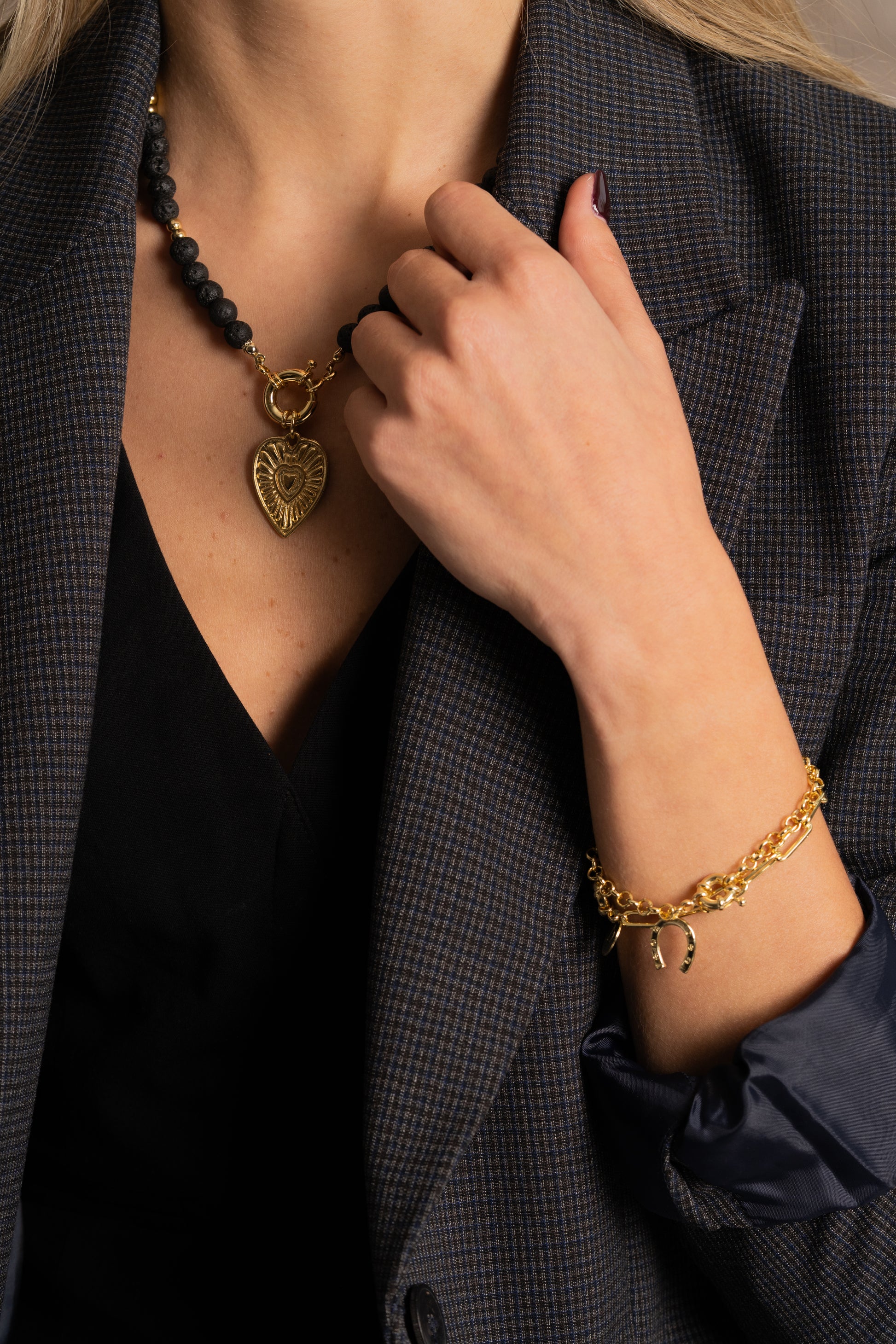 Collar de piedras negras con colgante de corazones y broche de timón.