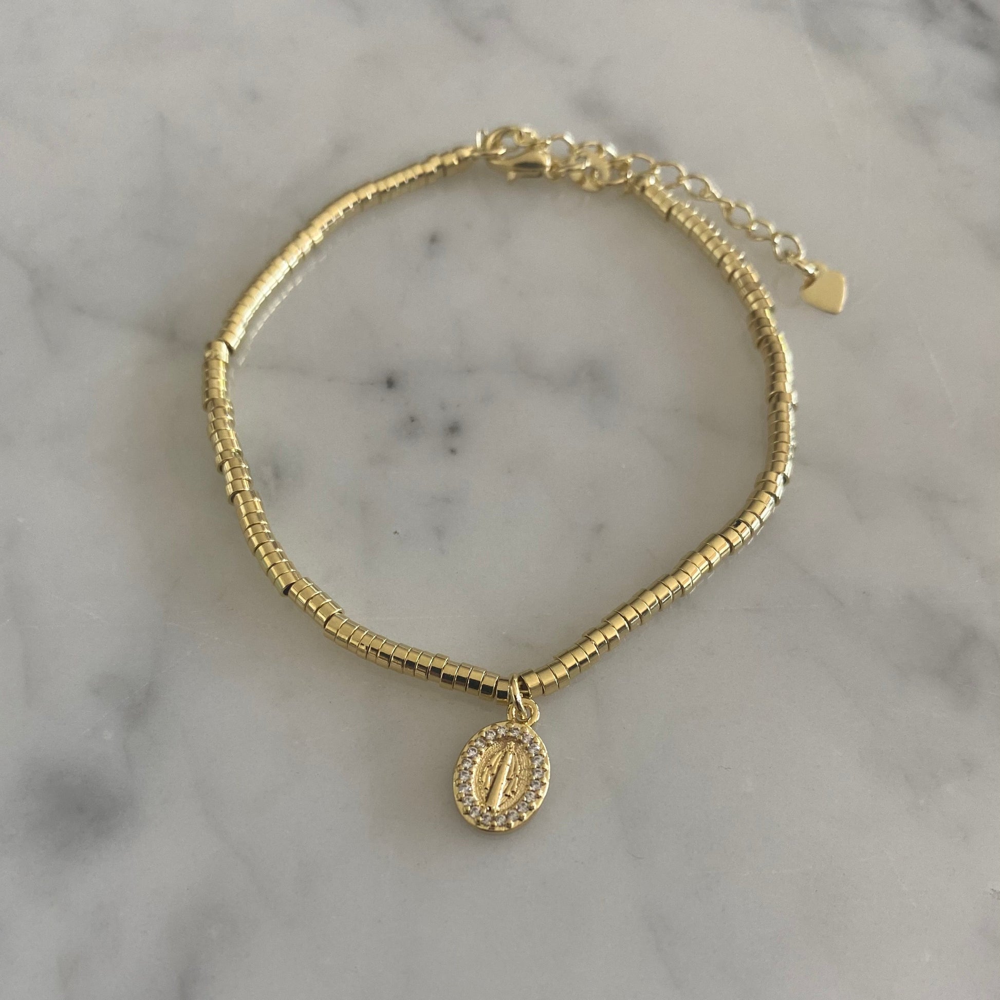 Pulsera de mostacillas tubo bañada en oro con Virgen de circones de 17 cms.