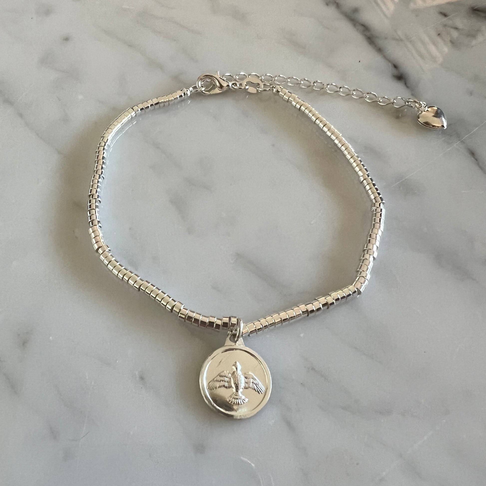 Pulsera de mostacillas tubo bañada en plata con medalla del Espíritu Santo