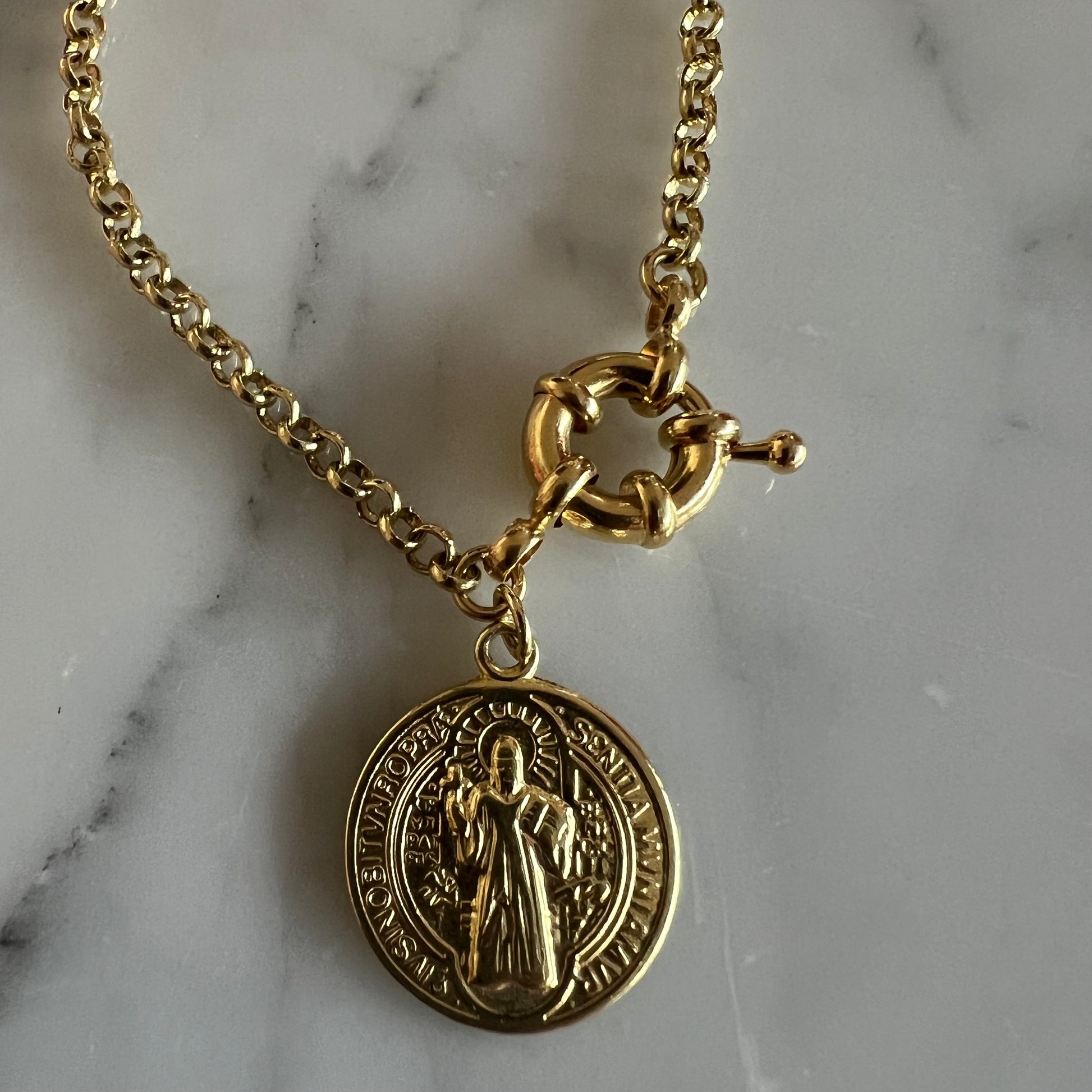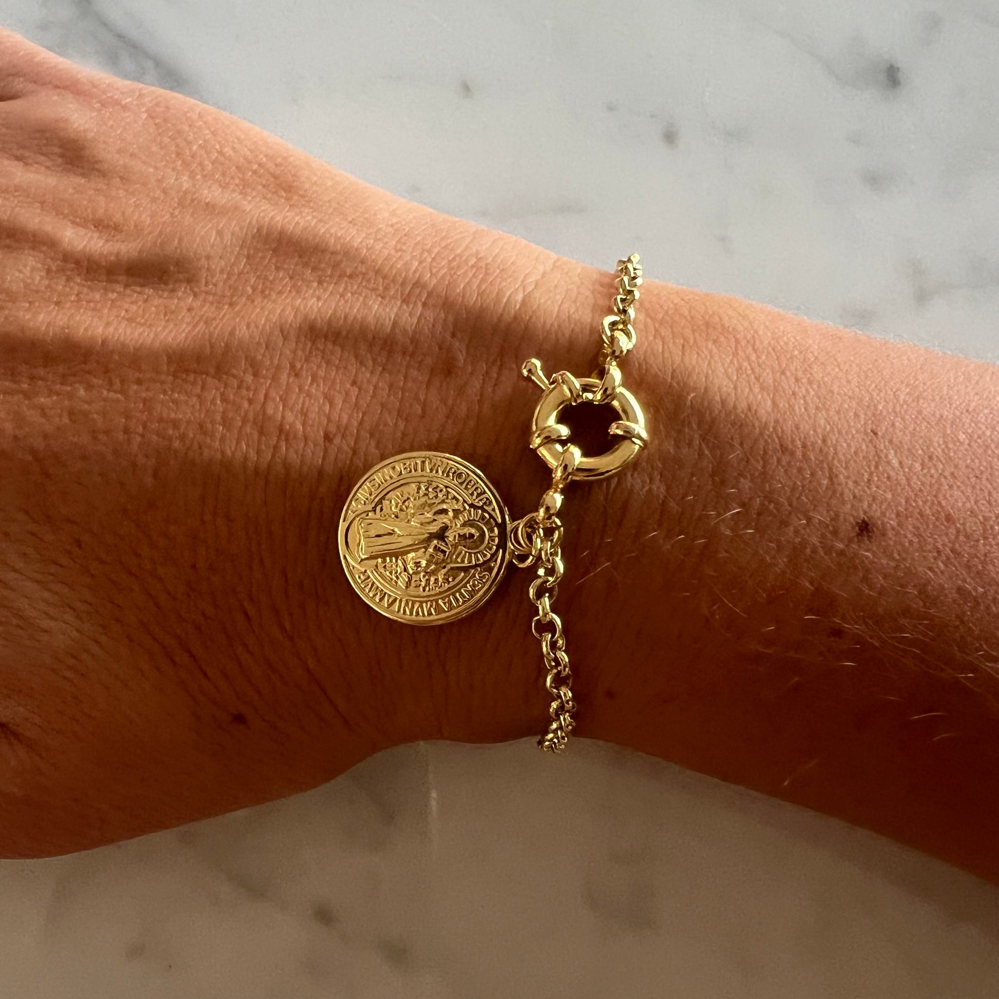 Pulsera bañada en oro cadena rolo con broche timón y medalla San Benito